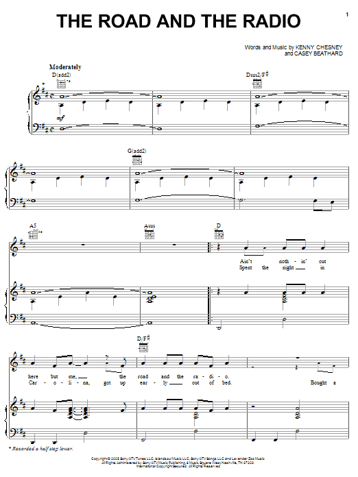 Download or print Kenny Chesney The Road And The Radio sheet music, chords and digital score arranged for Piano, Vocal & Guitar Chords (Right-Hand Melody). This Country score includes 7 page(s).