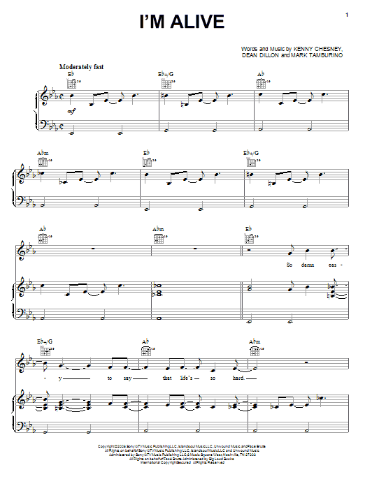 Download or print Kenny Chesney with Dave Matthews I'm Alive sheet music, chords and digital score arranged for Piano, Vocal & Guitar Chords (Right-Hand Melody). This Country score includes 7 page(s).
