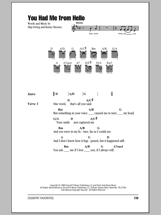 Download or print Kenny Chesney You Had Me From Hello sheet music, chords and digital score arranged for Piano, Vocal & Guitar Chords (Right-Hand Melody). This Country score includes 7 page(s).
