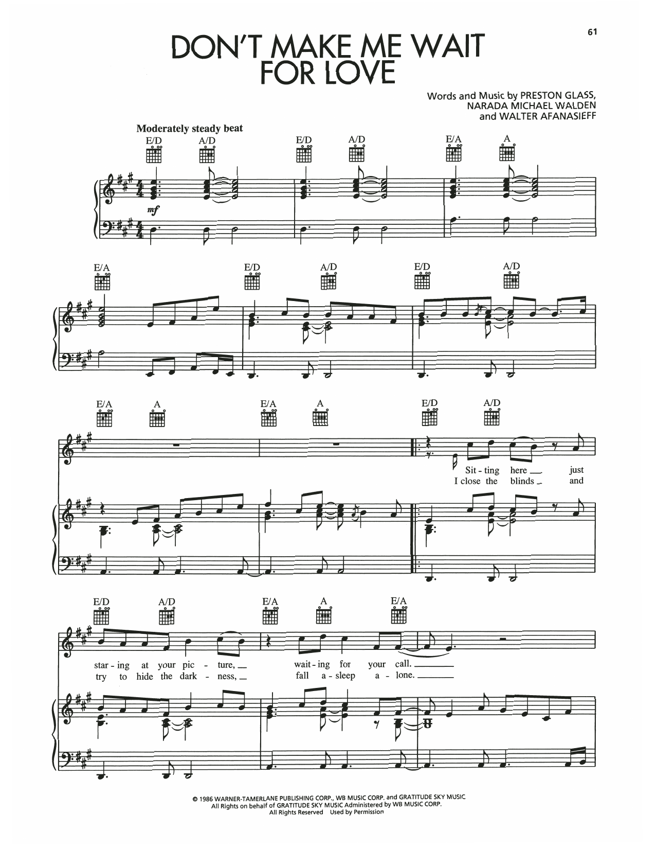 Download or print Kenny G Don't Make Me Wait For Love sheet music, chords and digital score arranged for Piano, Vocal & Guitar Chords (Right-Hand Melody). This Jazz score includes 5 page(s).
