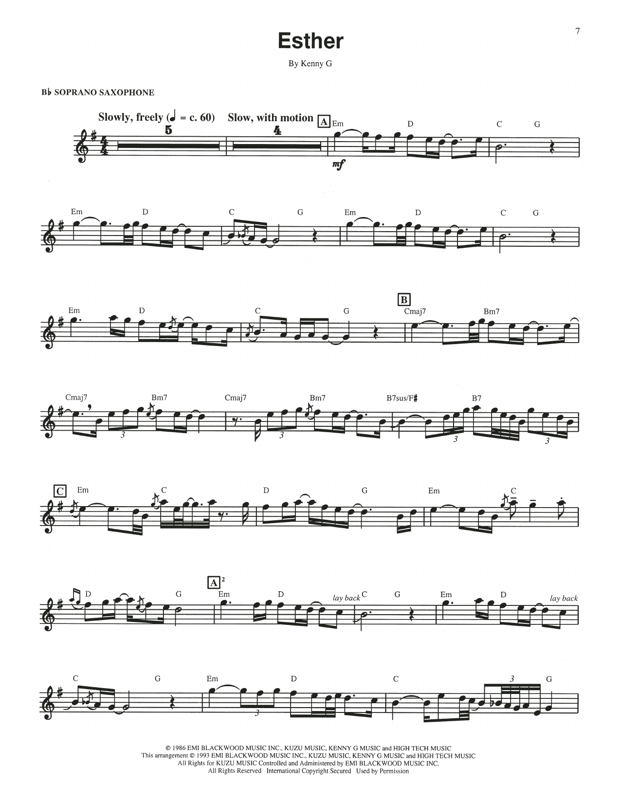 Download or print Kenny G Esther sheet music, chords and digital score arranged for Soprano Sax Transcription. This Jazz score includes 3 page(s).