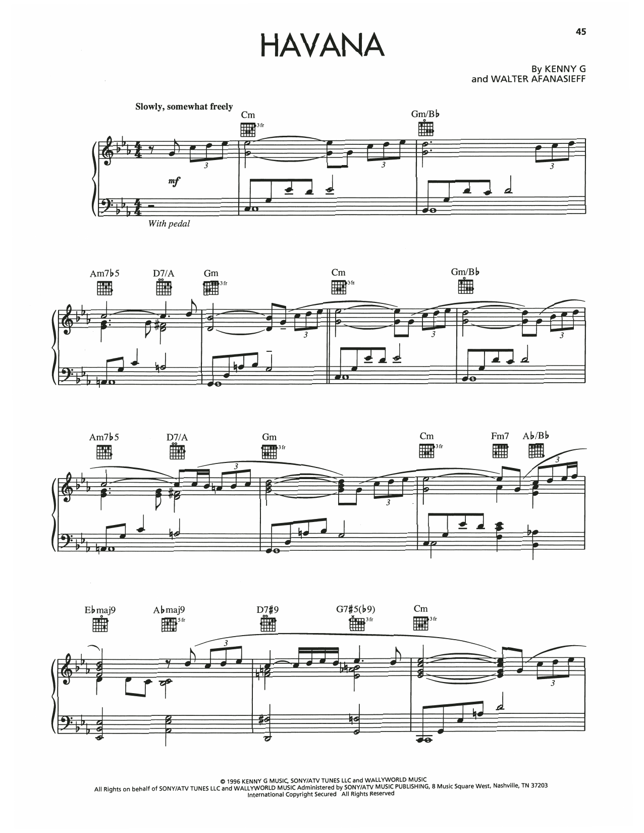 Download or print Kenny G Havana sheet music, chords and digital score arranged for Piano Solo. This Jazz score includes 6 page(s).