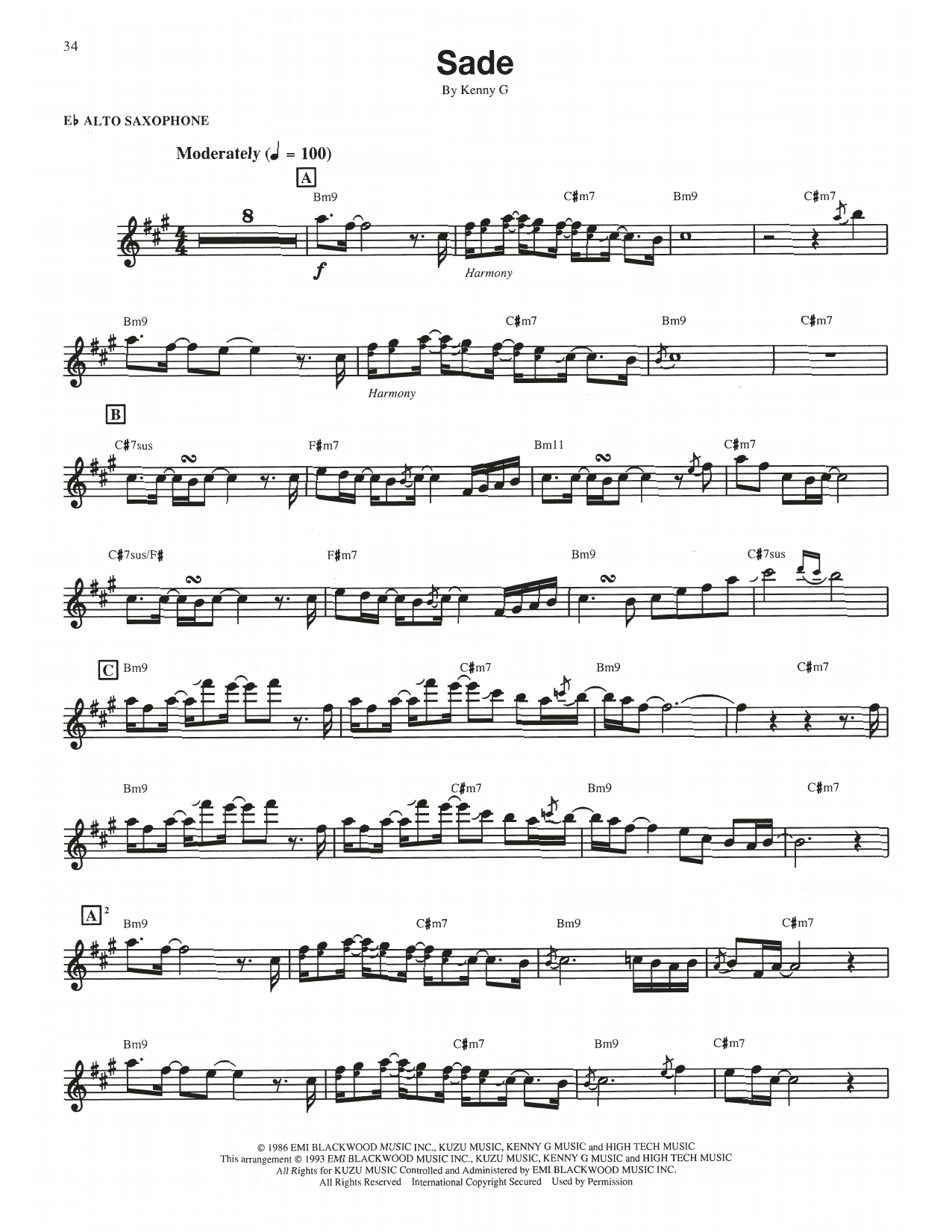 Download or print Kenny G Sade sheet music, chords and digital score arranged for Alto Sax Transcription. This Jazz score includes 3 page(s).
