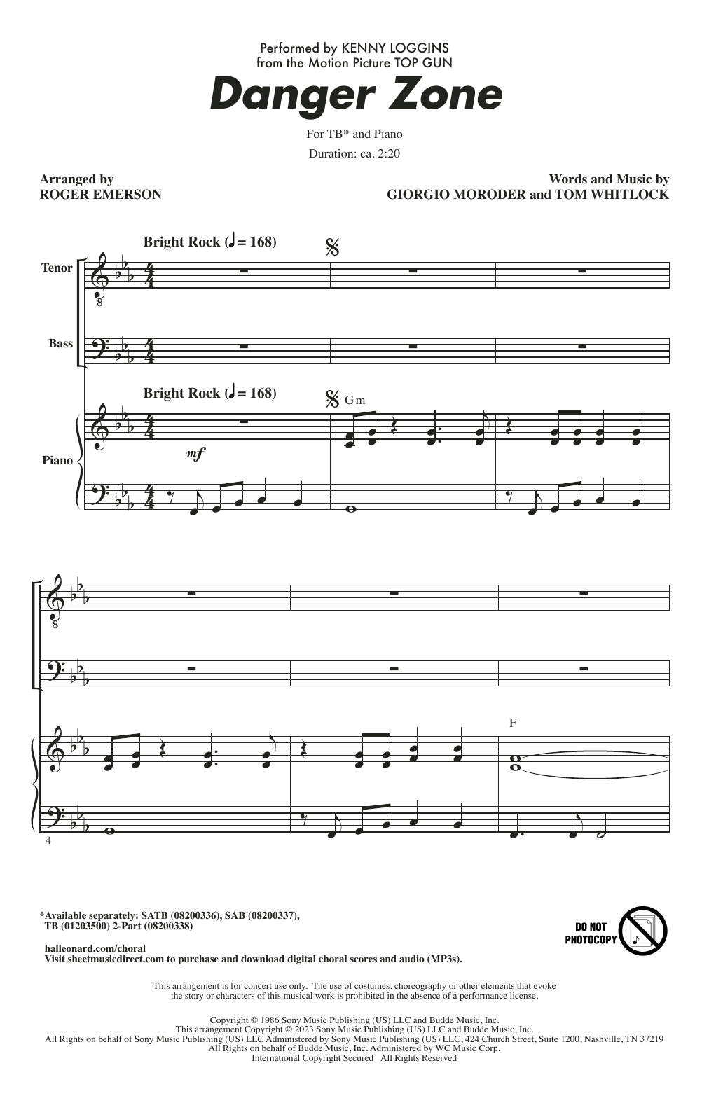 Download or print Kenny Loggins Danger Zone (from Top Gun) (arr. Roger Emerson) sheet music, chords and digital score arranged for TB Choir. This Film/TV score includes 9 page(s).
