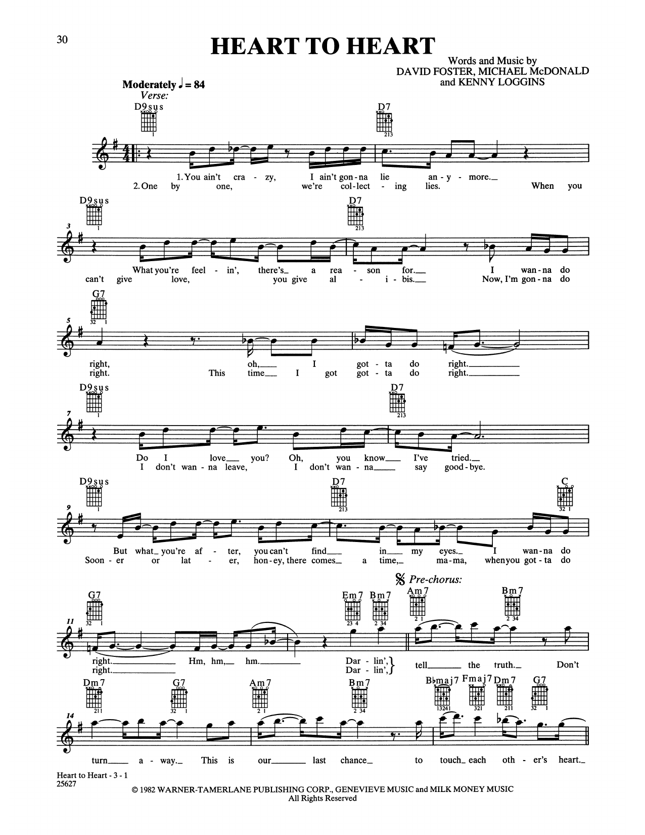 Download or print Kenny Loggins Heart To Heart sheet music, chords and digital score arranged for Piano, Vocal & Guitar Chords (Right-Hand Melody). This Pop score includes 8 page(s).