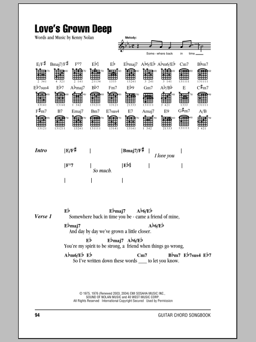 Download or print Kenny Nolan Love's Grown Deep sheet music, chords and digital score arranged for Lead Sheet / Fake Book. This Pop score includes 1 page(s).