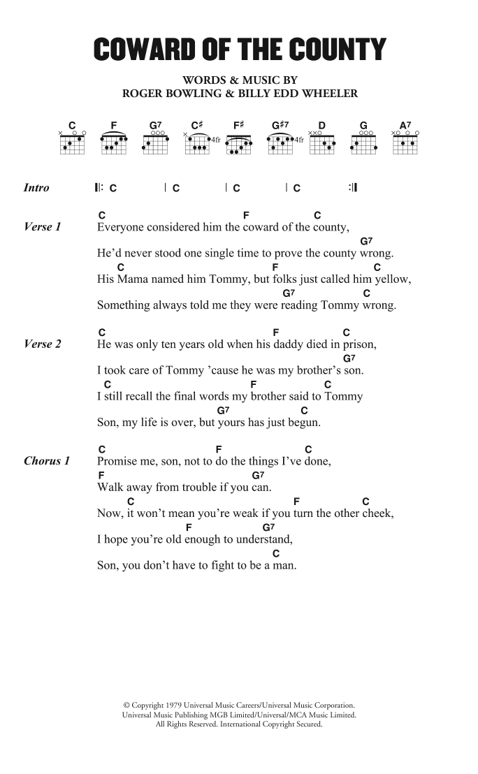 Download or print Kenny Rogers The Coward of the County sheet music, chords and digital score arranged for Guitar Chords/Lyrics. This Country score includes 3 page(s).
