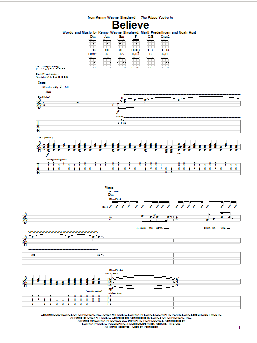 Download or print Kenny Wayne Shepherd Believe sheet music, chords and digital score arranged for Guitar Tab. This Blues score includes 13 page(s).