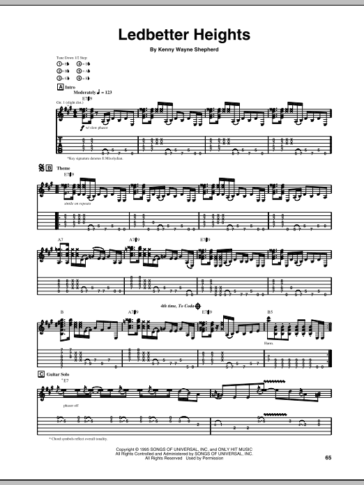 Download or print Kenny Wayne Shepherd Ledbetter Heights sheet music, chords and digital score arranged for Guitar Tab. This Blues score includes 9 page(s).
