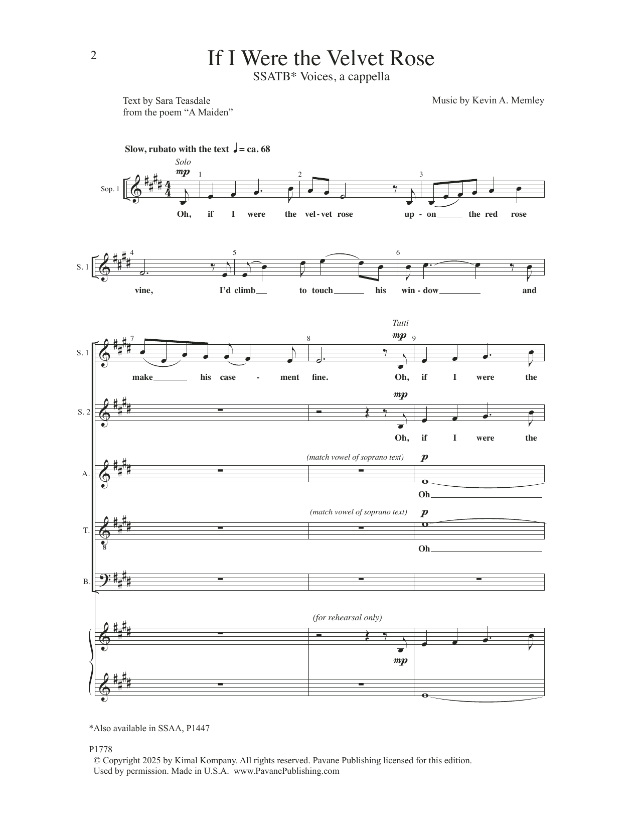 Download or print Kevin A. Memley If I Were the Velvet Rose sheet music, chords and digital score arranged for Choir. This Concert score includes 7 page(s).