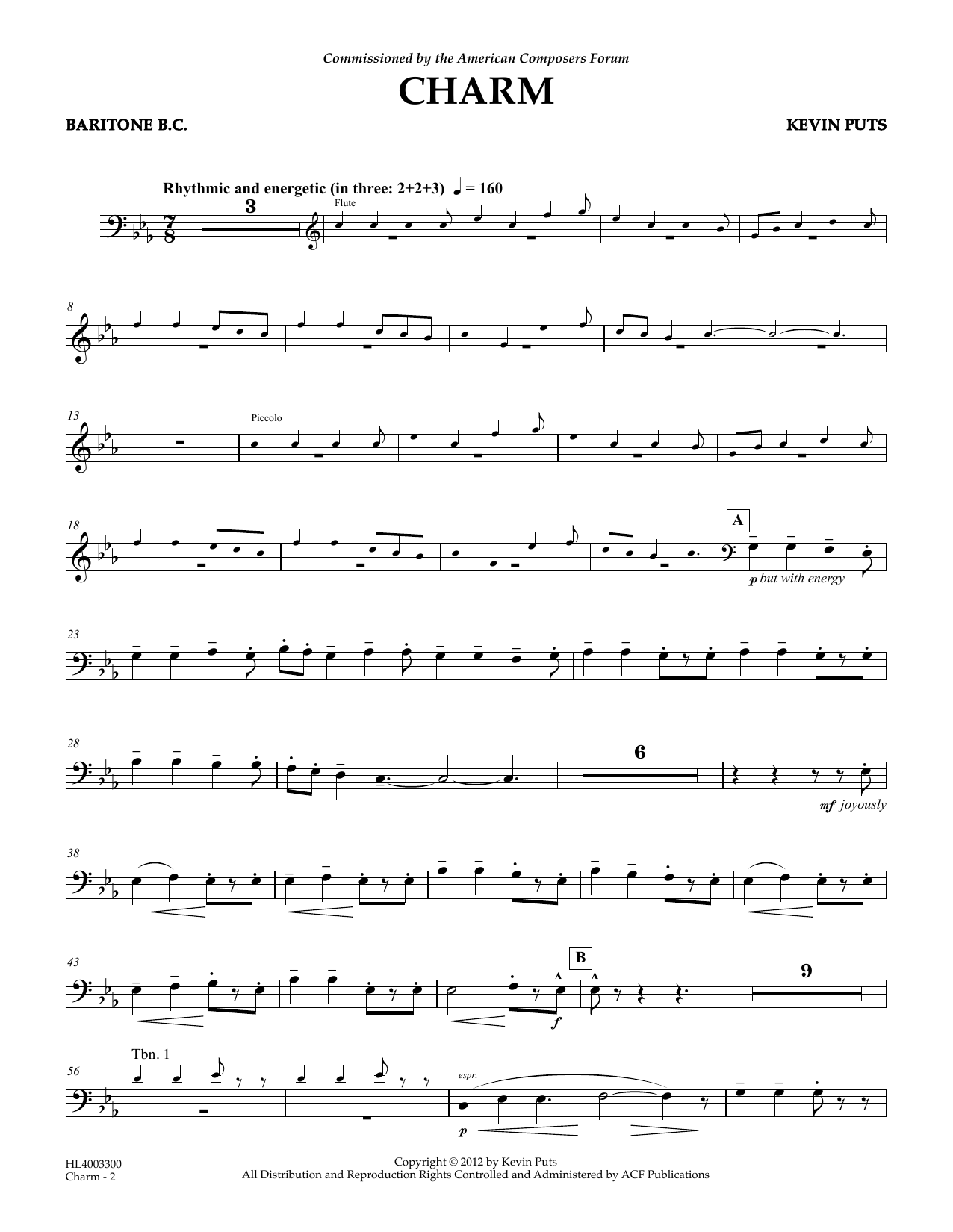 Download or print Kevin Puts Charm - Baritone B.C. sheet music, chords and digital score arranged for Concert Band. This Concert score includes 2 page(s).