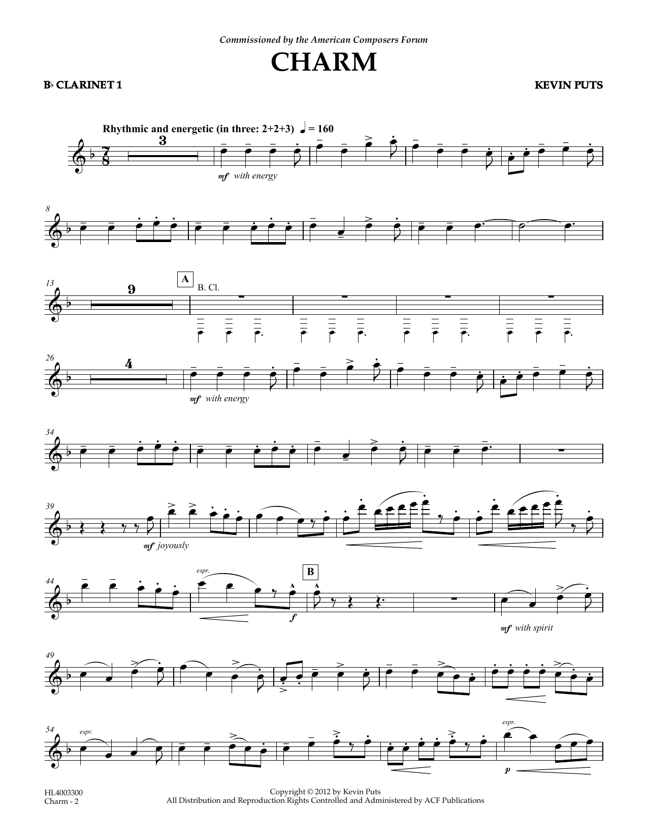 Download or print Kevin Puts Charm - Bb Clarinet 1 sheet music, chords and digital score arranged for Concert Band. This Concert score includes 2 page(s).