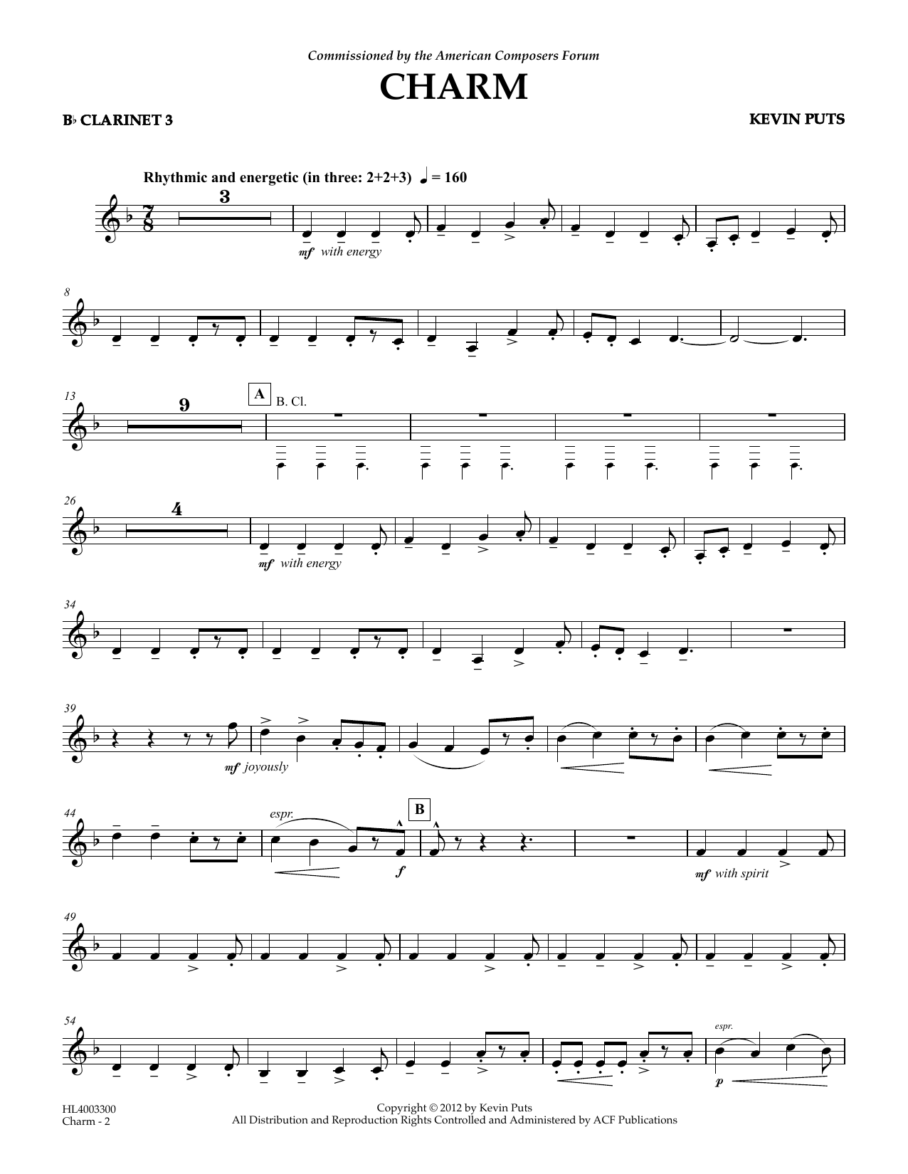 Download or print Kevin Puts Charm - Bb Clarinet 3 sheet music, chords and digital score arranged for Concert Band. This Concert score includes 2 page(s).