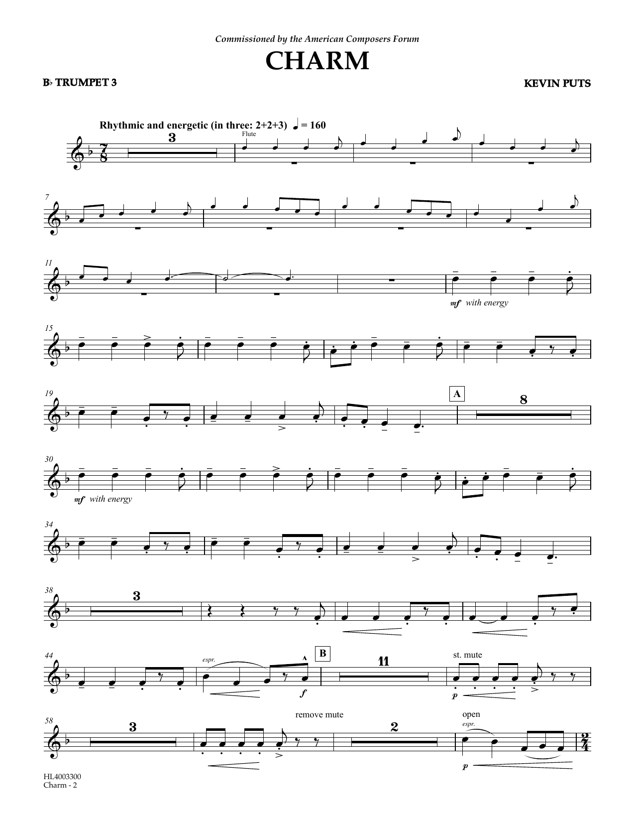 Download or print Kevin Puts Charm - Bb Trumpet 3 sheet music, chords and digital score arranged for Concert Band. This Concert score includes 2 page(s).