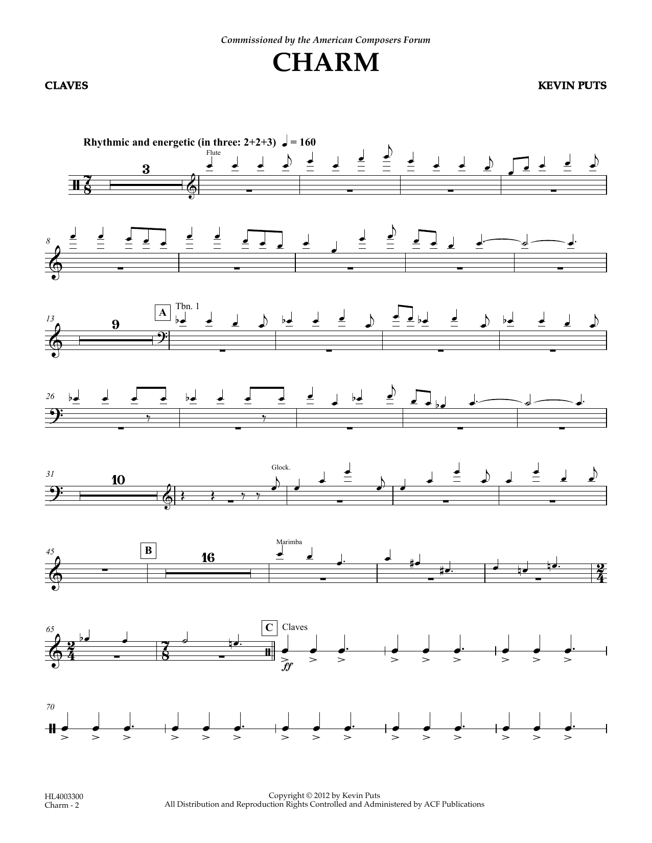 Download or print Kevin Puts Charm - Claves sheet music, chords and digital score arranged for Concert Band. This Concert score includes 2 page(s).