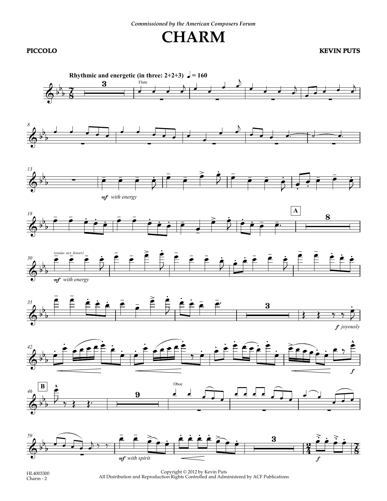 Download or print Kevin Puts Charm - Piccolo sheet music, chords and digital score arranged for Concert Band. This Concert score includes 2 page(s).