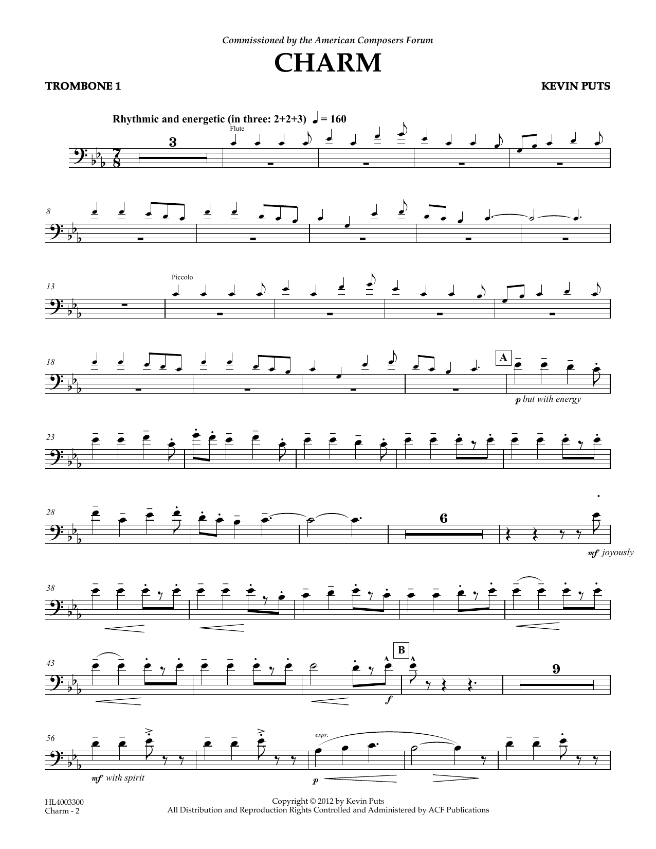 Download or print Kevin Puts Charm - Trombone 1 sheet music, chords and digital score arranged for Concert Band. This Concert score includes 2 page(s).