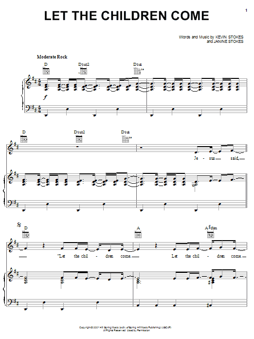 Download or print Kevin Stokes Let The Children Come sheet music, chords and digital score arranged for Piano, Vocal & Guitar Chords (Right-Hand Melody). This Children score includes 5 page(s).