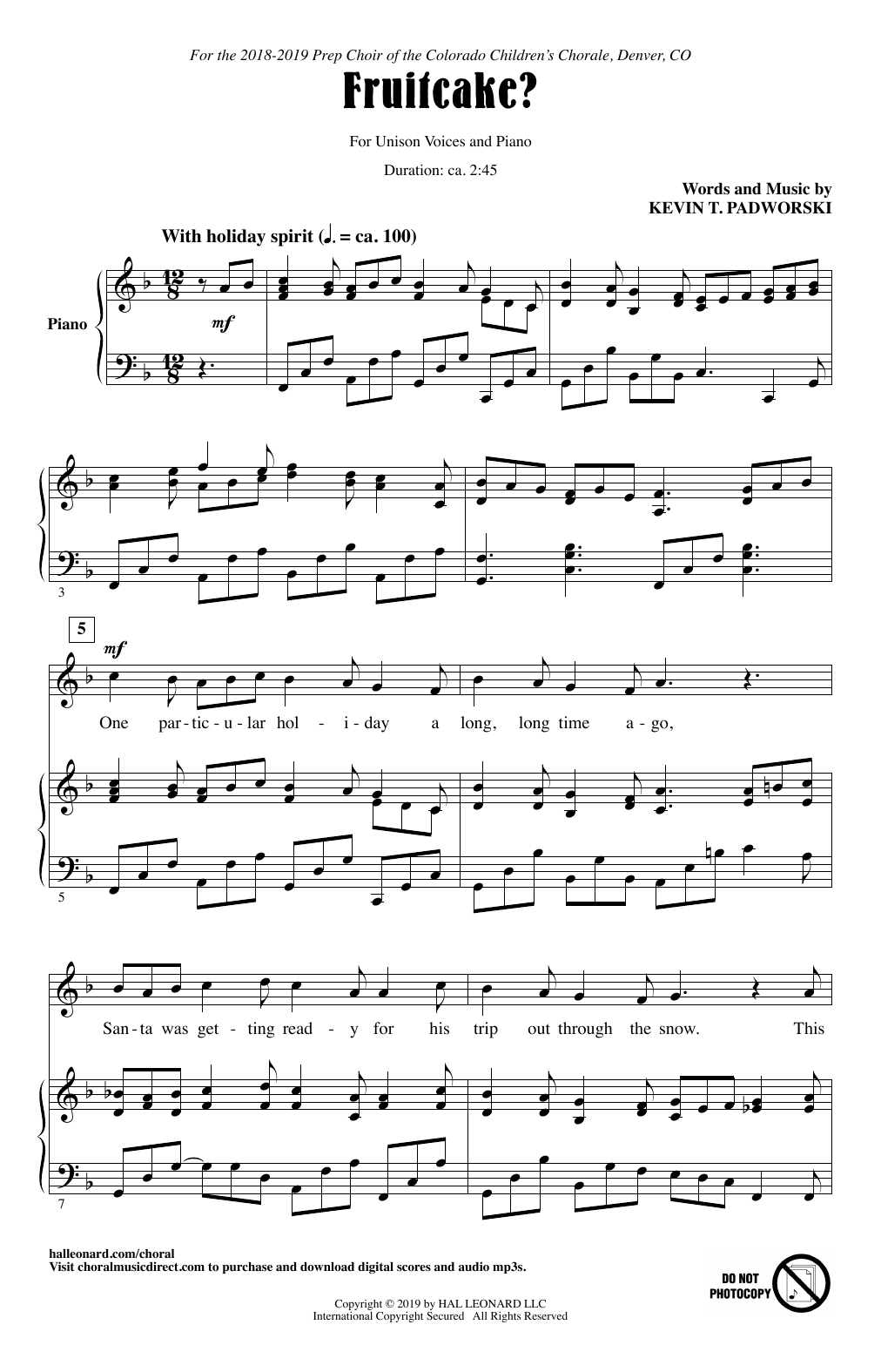 Download or print Kevin T. Padworski Fruitcake? sheet music, chords and digital score arranged for Unison Choir. This Concert score includes 7 page(s).