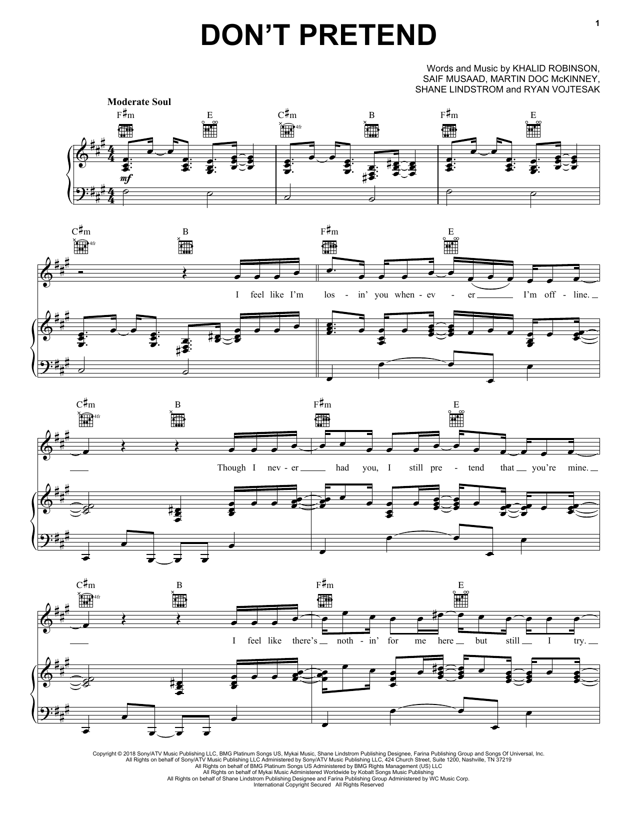 Download or print Khalid Don't Pretend (feat. SAFE) sheet music, chords and digital score arranged for Piano, Vocal & Guitar Chords (Right-Hand Melody). This Pop score includes 6 page(s).