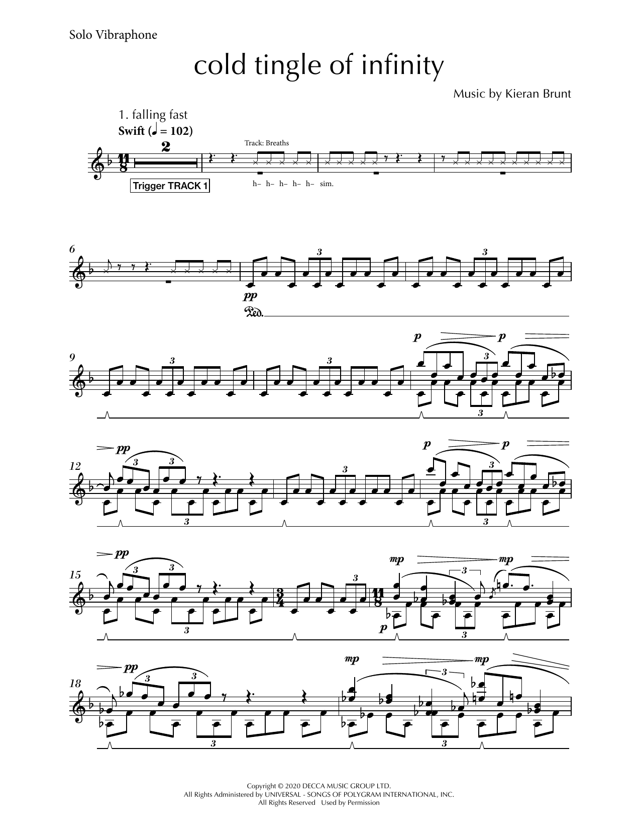 Download or print Kieran Brunt Cold Tingle Of Infinity sheet music, chords and digital score arranged for Vibraphone Solo. This Concert score includes 5 page(s).
