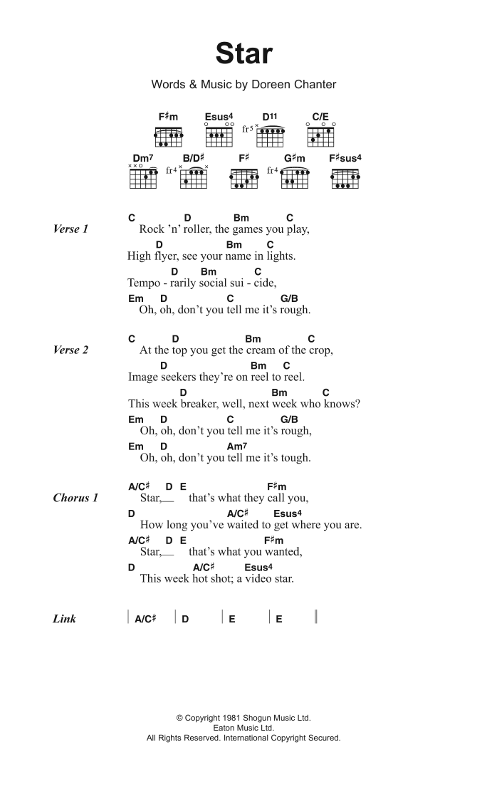 Download or print Kiki Dee Star sheet music, chords and digital score arranged for Guitar Chords/Lyrics. This Pop score includes 2 page(s).