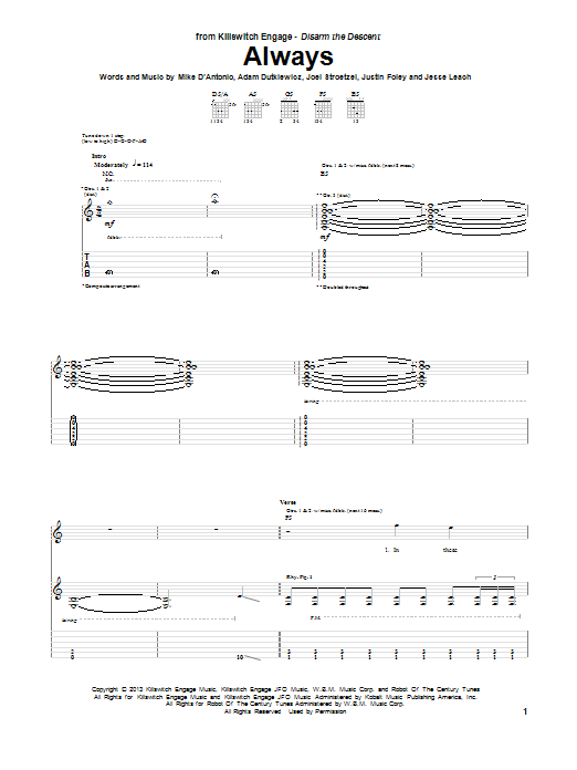 Download or print Killswitch Engage Always sheet music, chords and digital score arranged for Guitar Tab. This Pop score includes 8 page(s).