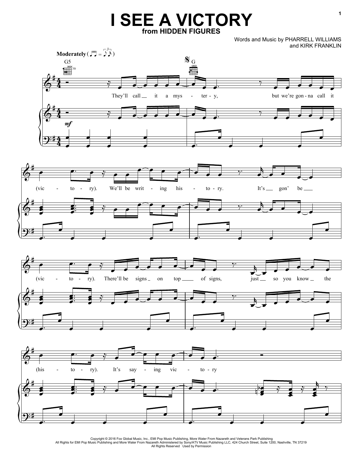 Download or print Kim Burrell and Pharrell Williams I See A Victory sheet music, chords and digital score arranged for Piano, Vocal & Guitar Chords (Right-Hand Melody). This Film/TV score includes 7 page(s).