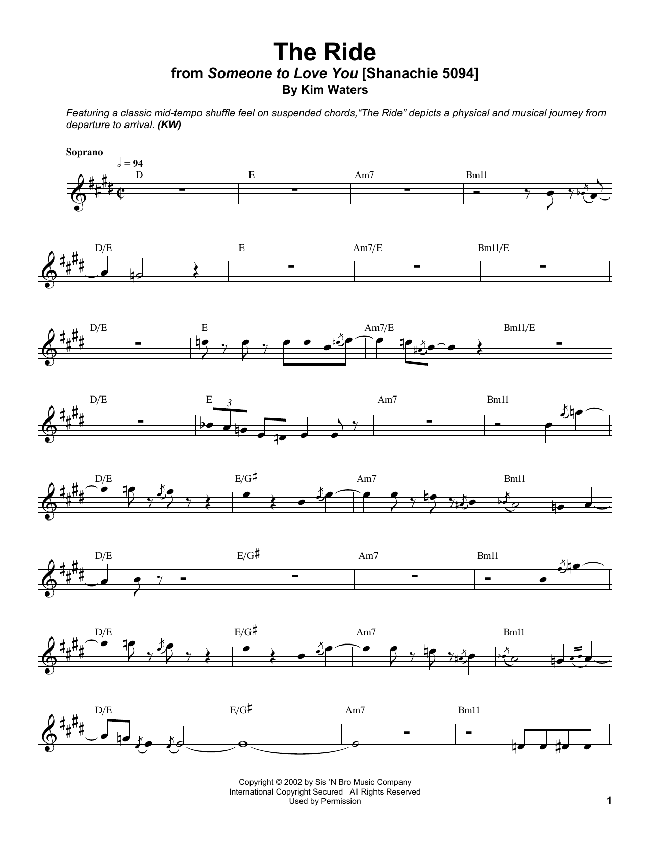 Download or print Kim Waters The Ride sheet music, chords and digital score arranged for Soprano Sax Transcription. This Jazz score includes 6 page(s).