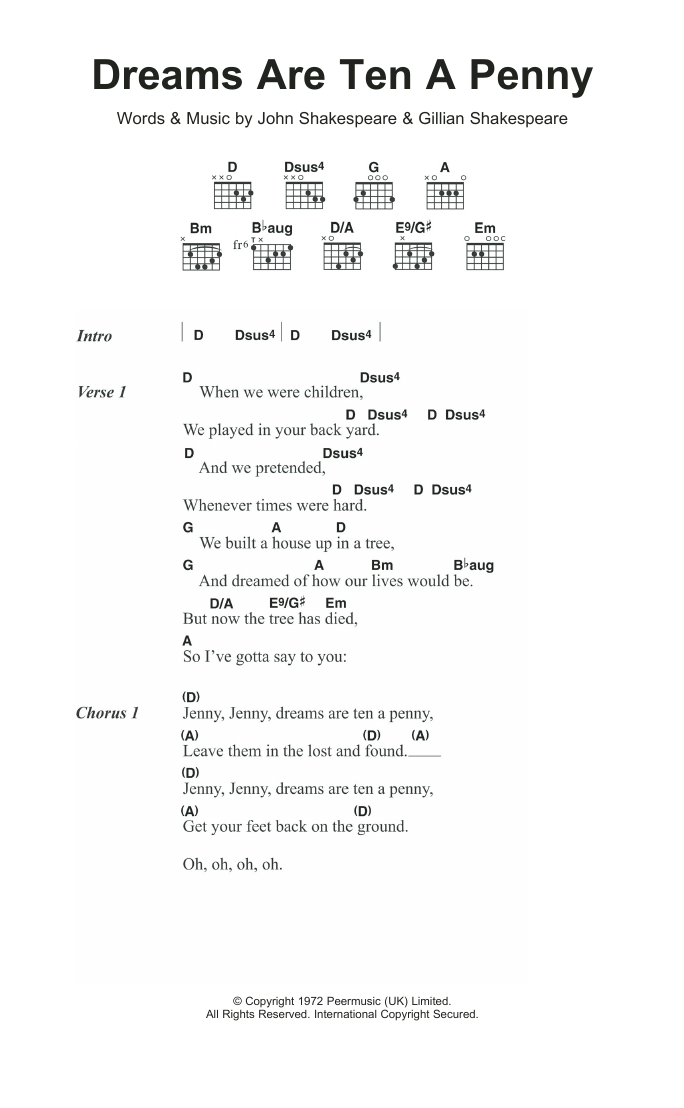 Download or print Kincade Dreams Are Ten A Penny sheet music, chords and digital score arranged for Guitar Chords/Lyrics. This Pop score includes 2 page(s).