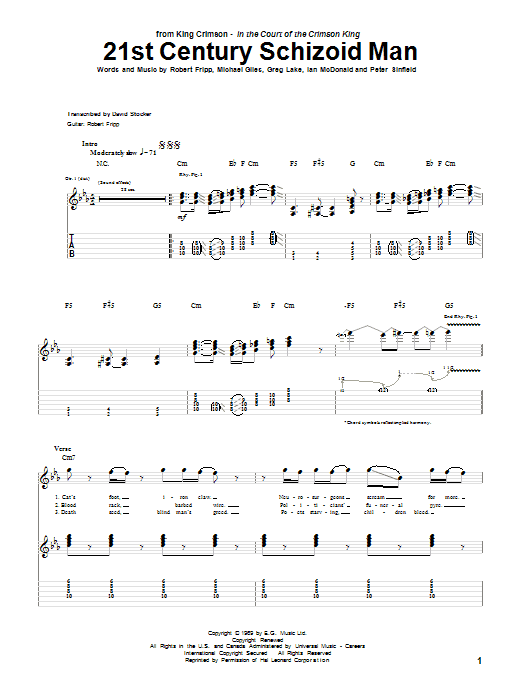 Download or print King Crimson 21st Century Schizoid Man sheet music, chords and digital score arranged for Guitar Tab (Single Guitar). This Pop score includes 9 page(s).