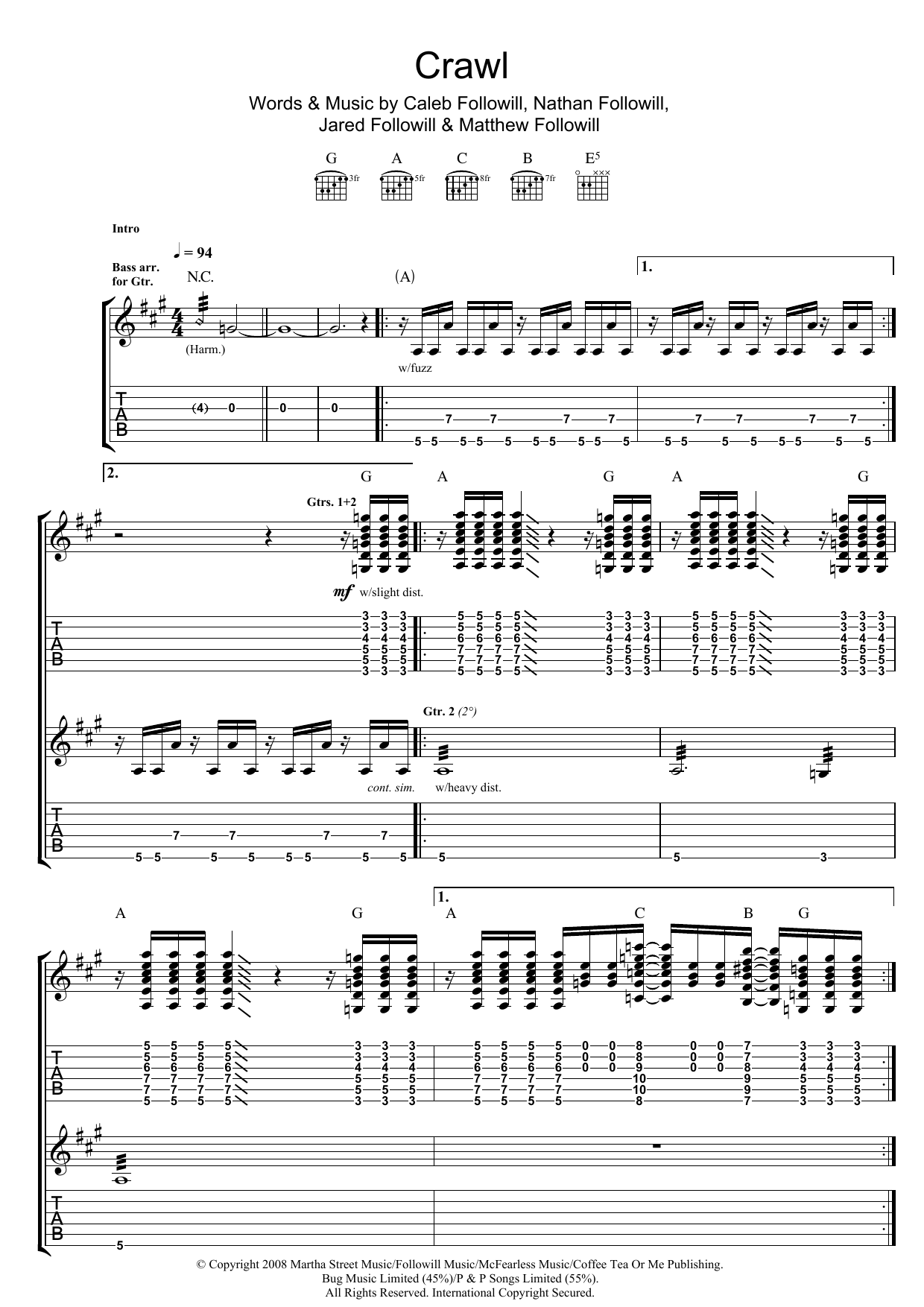 Download or print Kings Of Leon Crawl sheet music, chords and digital score arranged for Guitar Tab. This Pop score includes 9 page(s).
