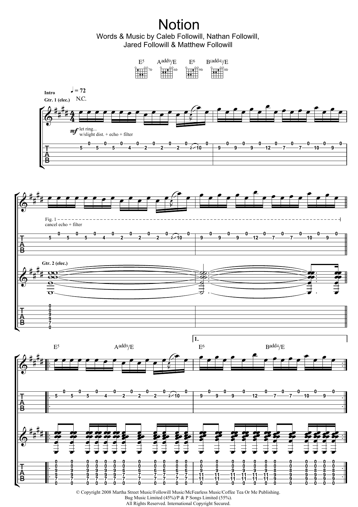 Download or print Kings Of Leon Notion sheet music, chords and digital score arranged for Guitar Chords/Lyrics. This Rock score includes 2 page(s).