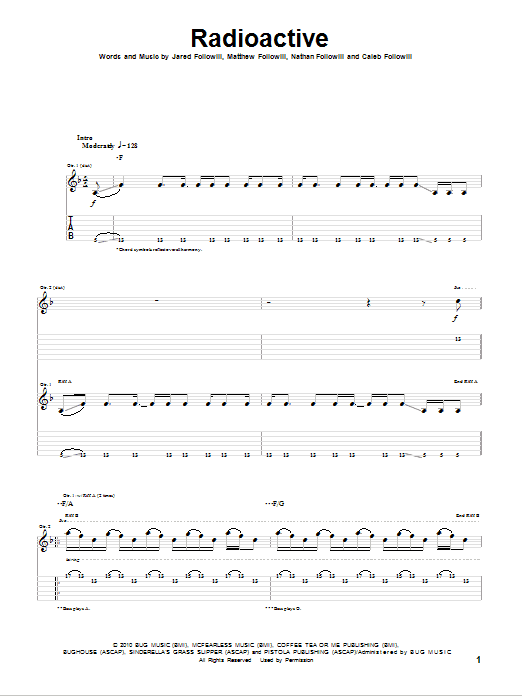 Download or print Kings Of Leon Radioactive sheet music, chords and digital score arranged for Guitar Tab. This Pop score includes 7 page(s).