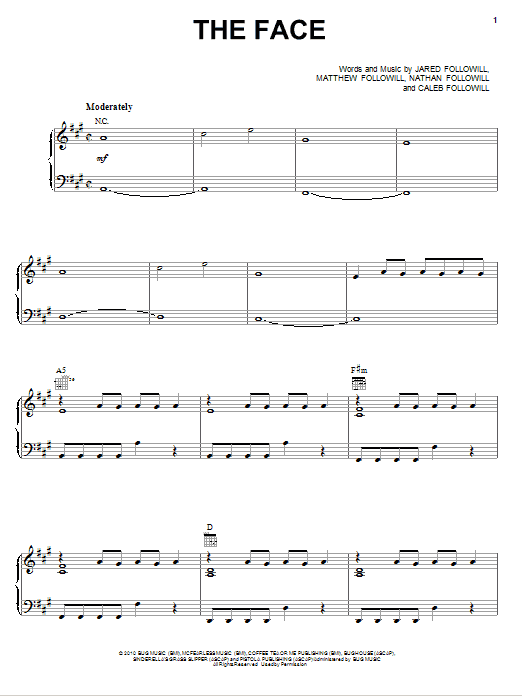 Download or print Kings Of Leon The Face sheet music, chords and digital score arranged for Piano, Vocal & Guitar Chords (Right-Hand Melody). This Pop score includes 7 page(s).
