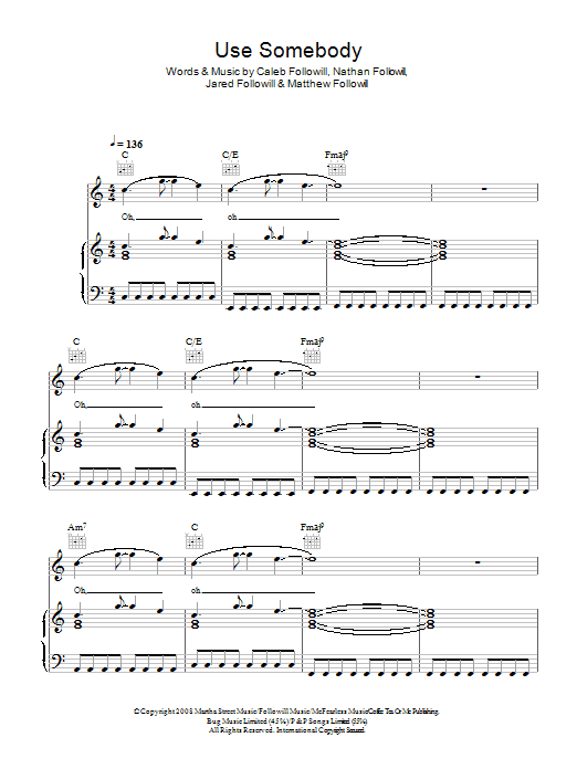 Download or print Kings Of Leon Use Somebody sheet music, chords and digital score arranged for Guitar Lead Sheet. This Pop score includes 3 page(s).