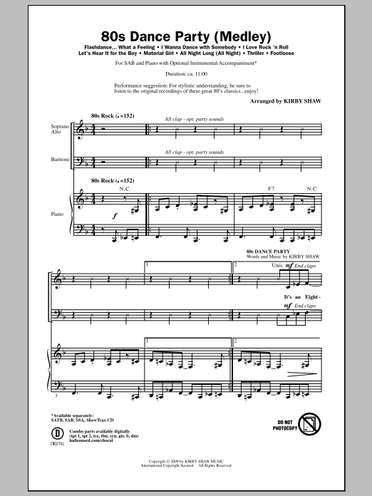 Download or print Kirby Shaw 80s Dance Party (Medley) sheet music, chords and digital score arranged for SAB Choir. This Pop score includes 45 page(s).