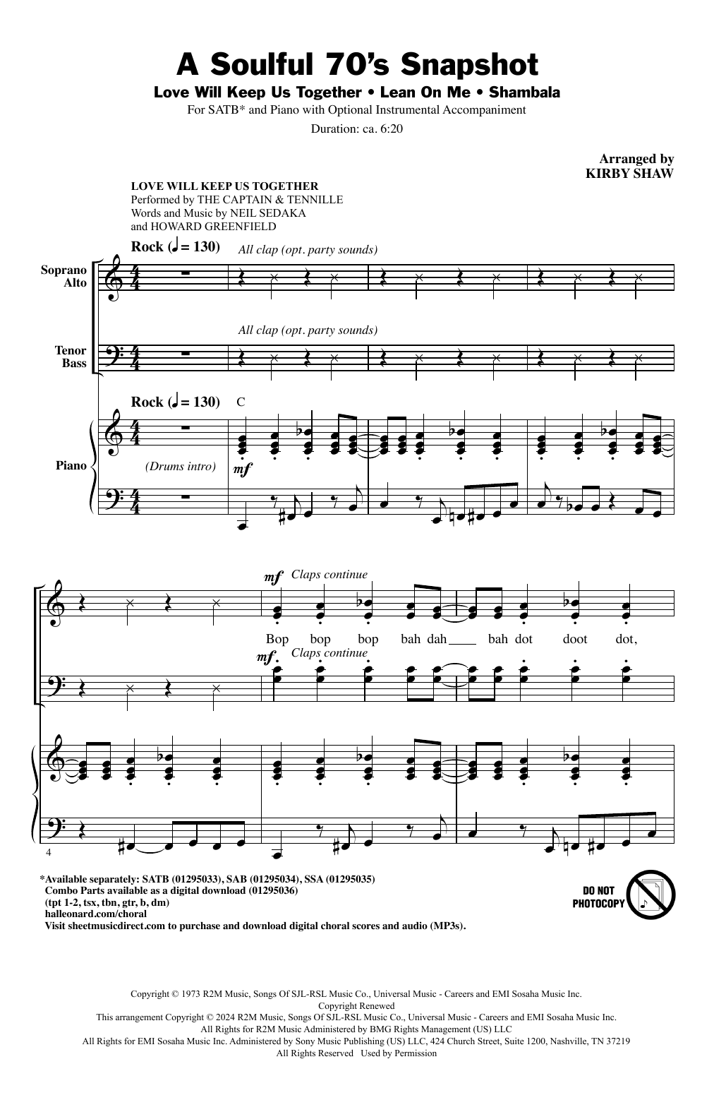 Download or print Kirby Shaw A Soulful 70's Snapshot (Medley) sheet music, chords and digital score arranged for SAB Choir. This Pop score includes 22 page(s).