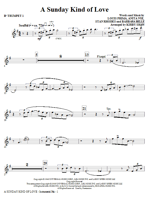 Download or print Kirby Shaw A Sunday Kind of Love - Bb Trumpet 1 sheet music, chords and digital score arranged for Choir Instrumental Pak. This Jazz score includes 2 page(s).