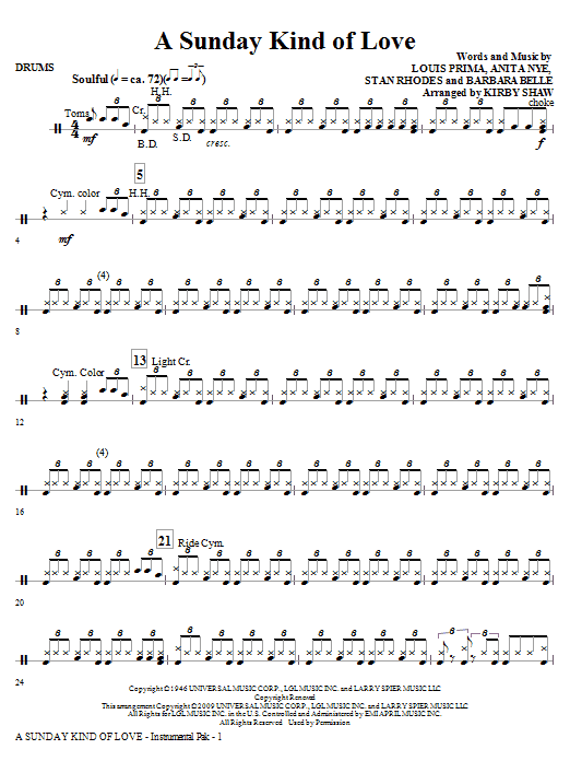 Download or print Kirby Shaw A Sunday Kind of Love - Drums sheet music, chords and digital score arranged for Choir Instrumental Pak. This Jazz score includes 2 page(s).