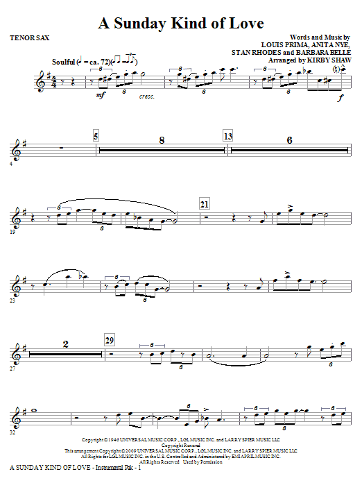 Download or print Kirby Shaw A Sunday Kind of Love - Tenor Sax sheet music, chords and digital score arranged for Choir Instrumental Pak. This Jazz score includes 2 page(s).