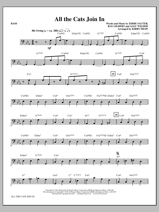 Download or print Kirby Shaw All The Cats Join In - Bass sheet music, chords and digital score arranged for Choir Instrumental Pak. This Jazz score includes 2 page(s).