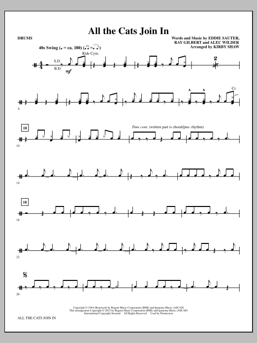Download or print Kirby Shaw All The Cats Join In - Drums sheet music, chords and digital score arranged for Choir Instrumental Pak. This Jazz score includes 2 page(s).