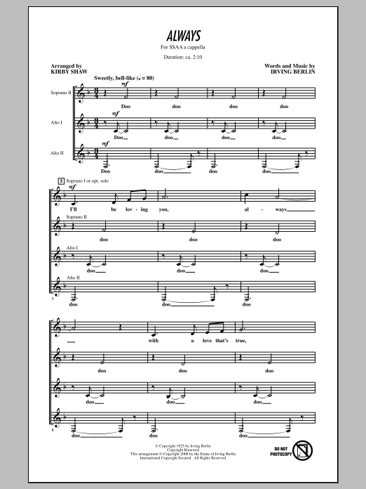 Download or print Kirby Shaw Always sheet music, chords and digital score arranged for SSA Choir. This Standards score includes 6 page(s).