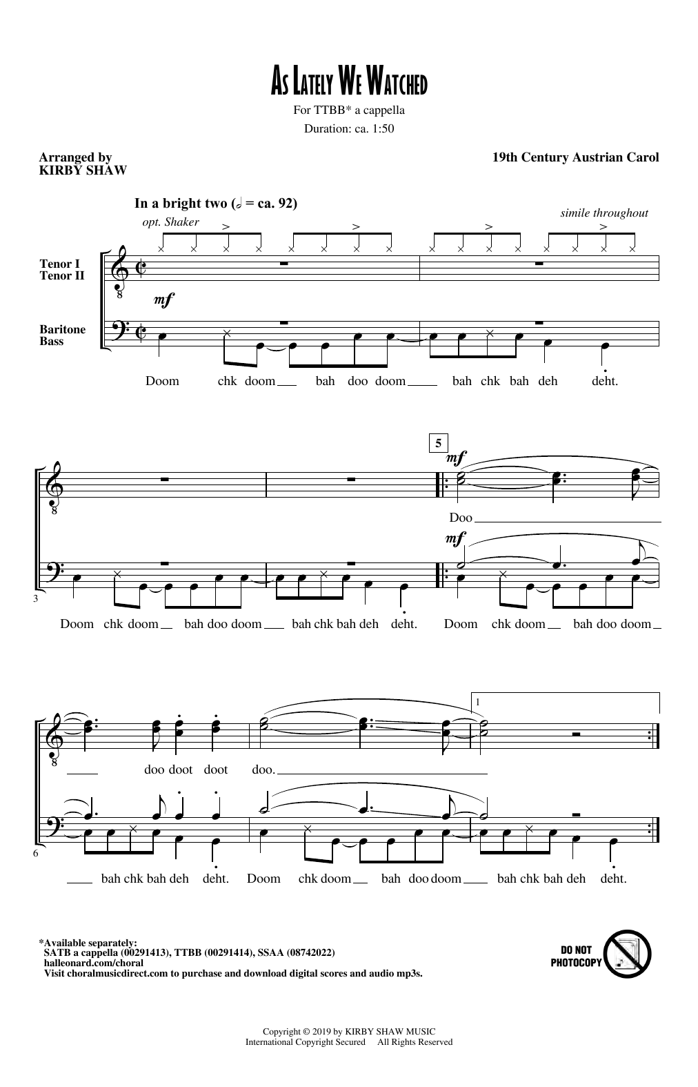 Download or print Kirby Shaw As Lately We Watched sheet music, chords and digital score arranged for TTBB Choir. This A Cappella score includes 7 page(s).