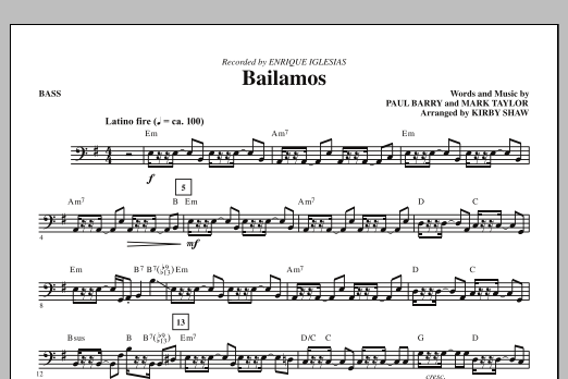 Download or print Kirby Shaw Bailamos - Bass sheet music, chords and digital score arranged for Choir Instrumental Pak. This Pop score includes 1 page(s).