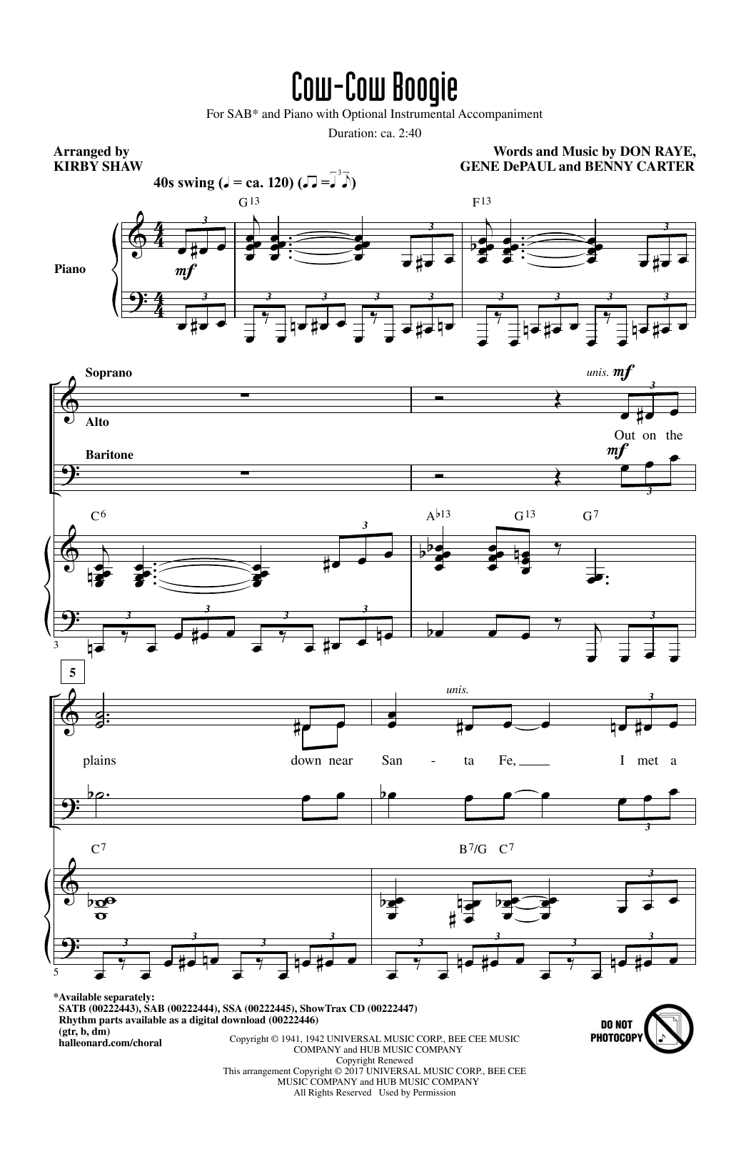 Download or print Kirby Shaw Cow-Cow Boogie sheet music, chords and digital score arranged for SSA Choir. This Blues score includes 15 page(s).