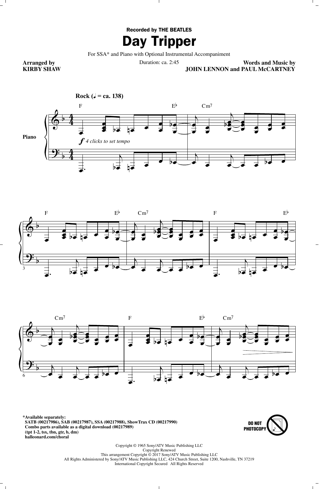 Download or print Kirby Shaw Day Tripper sheet music, chords and digital score arranged for SAB Choir. This Pop score includes 10 page(s).