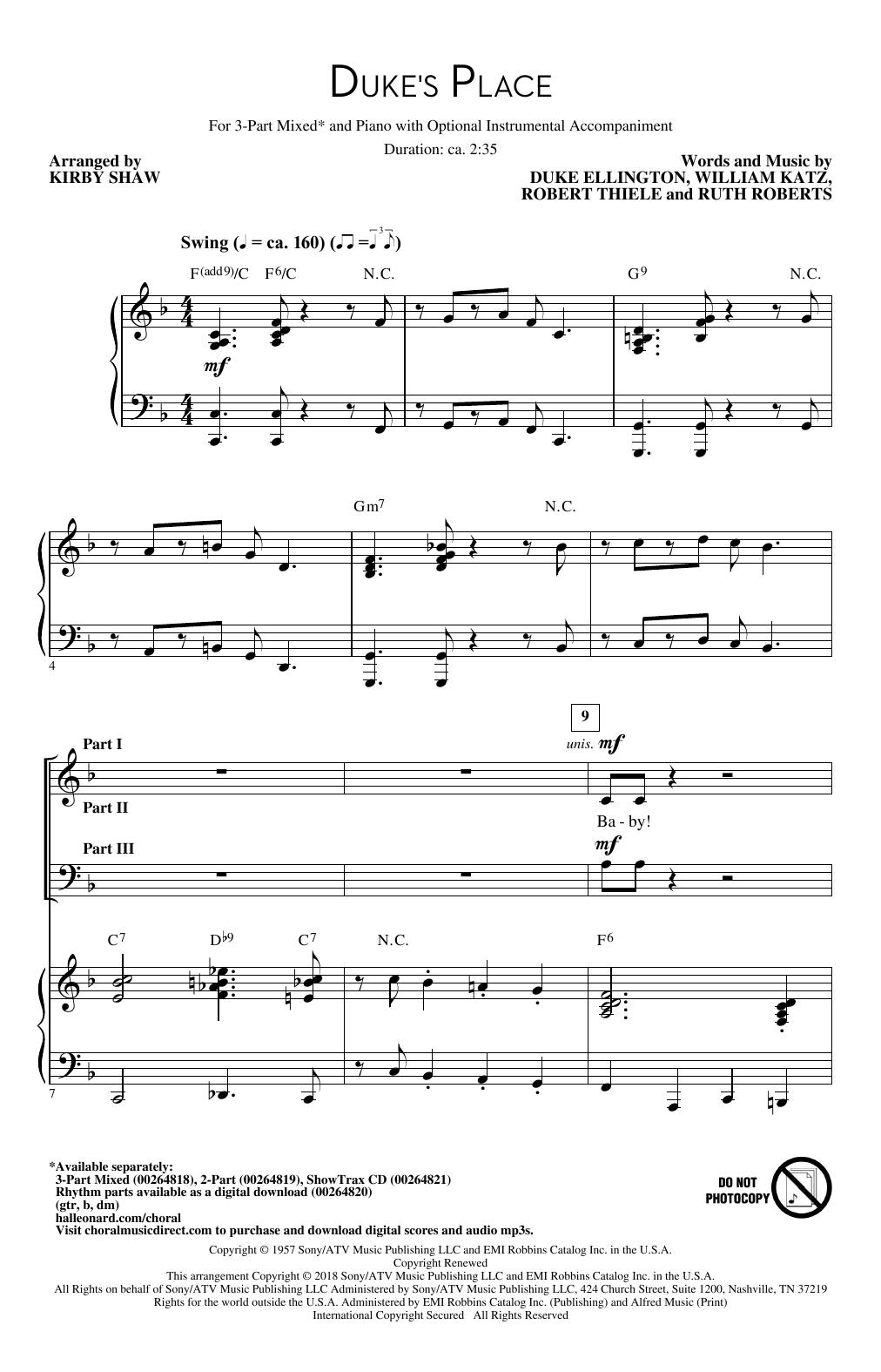 Download or print Kirby Shaw Duke's Place sheet music, chords and digital score arranged for 3-Part Mixed Choir. This Jazz score includes 10 page(s).