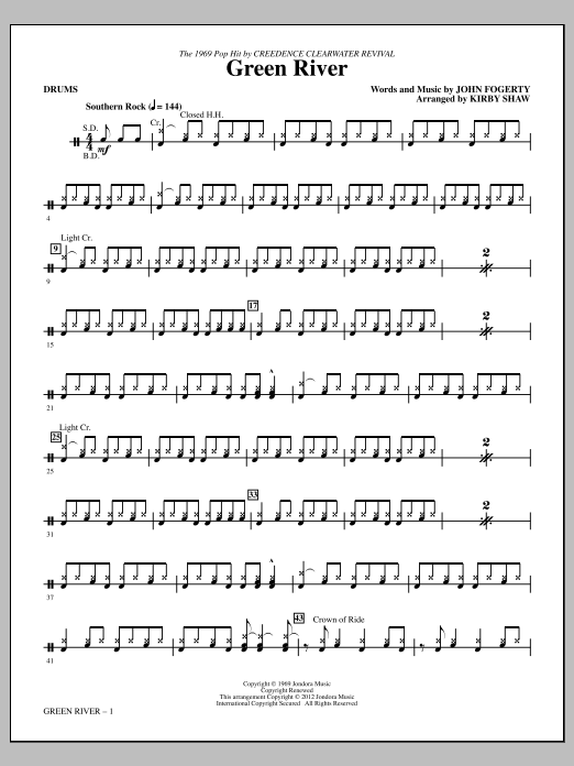 Download or print Kirby Shaw Green River - Drums sheet music, chords and digital score arranged for Choir Instrumental Pak. This Pop score includes 2 page(s).